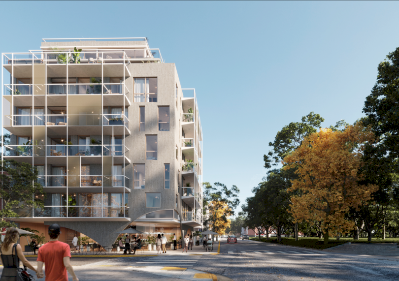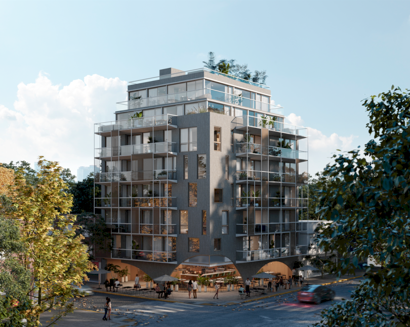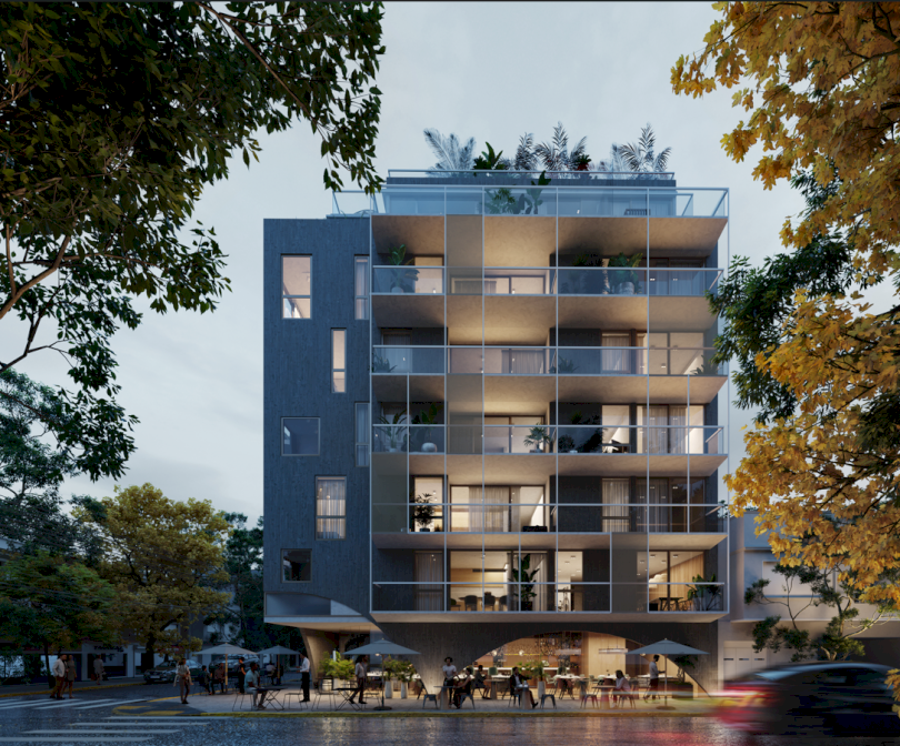 Zapiola. Desarrollo en ochava con local comercial en PB.